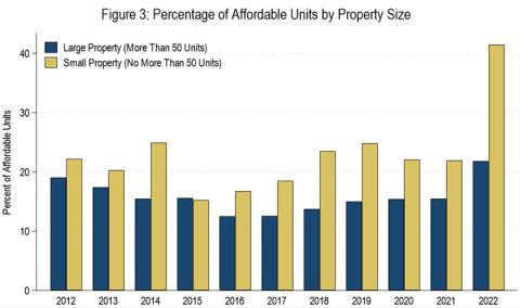 Typically, small multifamily properties are more likely to provide naturally occurring affordable housing based on smaller loan sizes and lower operating costs. However, an increase of affordable units in large multifamily properties also expands affordable housing in various property types (e.g., garden and high-rise apartment complexes) and promotes neighborhood socio-economic integration. Figure 3 below presents the trends over the past decade for the percentage of affordable units for small and large properties.