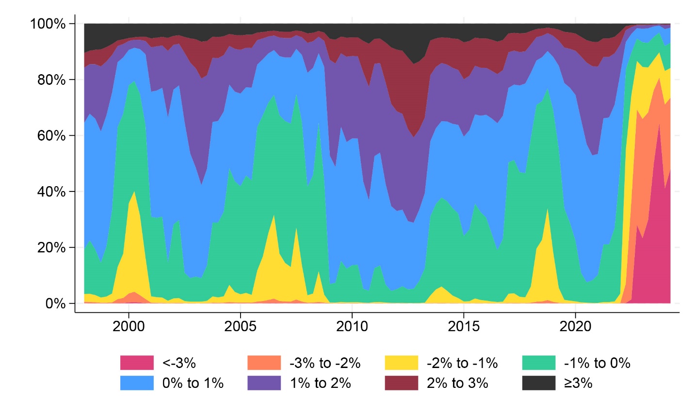 As of 2024Q2, the average rate delta was -2.54, indicating that the average loan has a fixed rate that is 2.54 percentage points lower than the current market rate for similar loans. This difference has slightly decreased since 2023Q4, when it was over three percentage points. This level of lock-in is unprecedented in recent history. As shown in Figure 1, the rise in warmer colors after 2020 indicates the vast majority of loans have a negative rate delta. The last quarter century has never experienced such a sharp and pervasive increase in mortgage rate lock-in.